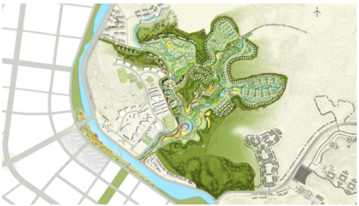 場(chǎng)地空間設(shè)計(jì):通過(guò)對(duì)場(chǎng)地的分析,在標(biāo)高295m以下,山體較為平緩,該區(qū)域的人為活動(dòng)頻繁,適宜做城市設(shè)計(jì)。整合場(chǎng)地空間,將城市的構(gòu)造與自然環(huán)境相連接。