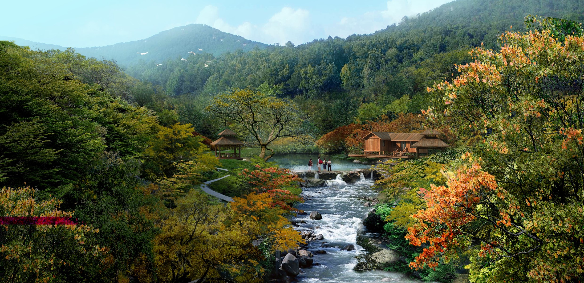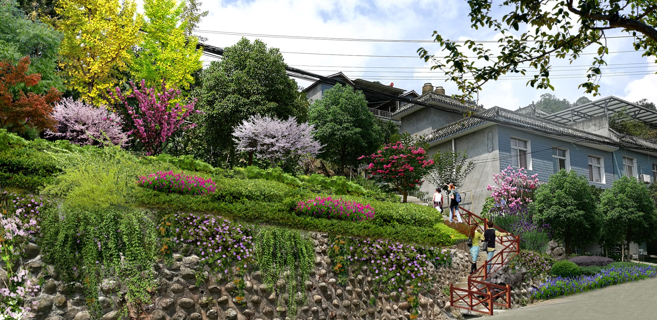 項目位于都江堰市大觀鎮(zhèn)西北方,屬大青城山旅游區(qū)組成部分,紅梅村地處青城外山北部,距鎮(zhèn)區(qū)約6公里,村莊總面積約378.89 h㎡,主要對建筑立面、村道、河道、步道、房前屋后、水體周邊、基礎(chǔ)設(shè)施進行景觀環(huán)境提升設(shè)計。