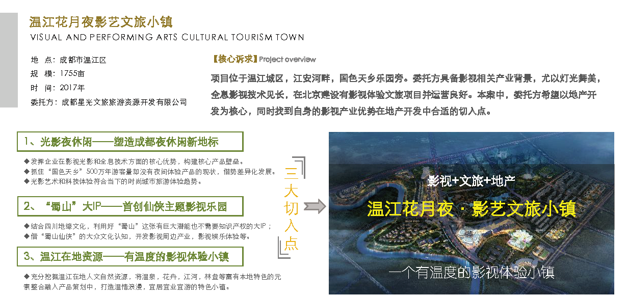 占地面積約1000畝左右,建筑規(guī) 模100-150萬平米,將著力打造成都新地標(biāo)。項(xiàng)目依托北京星光影視園在文 化旅游、電視節(jié)目制作、影視體驗(yàn)、傳媒服務(wù)、影視拓展領(lǐng)域的先進(jìn)經(jīng)驗(yàn), 結(jié)合成都的地理優(yōu)勢、消費(fèi)潛力、國家西部大開發(fā)的戰(zhàn)略,形成“文化產(chǎn)業(yè) 園區(qū)+文化旅游景區(qū)+休閑度假小鎮(zhèn)+金融小鎮(zhèn)”的獨(dú)特產(chǎn)業(yè)推動模式。