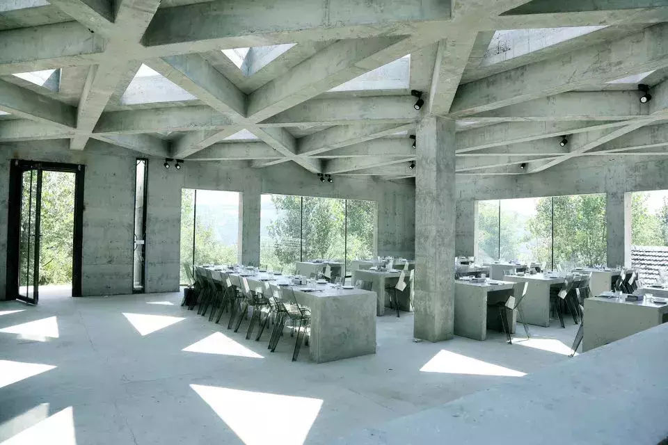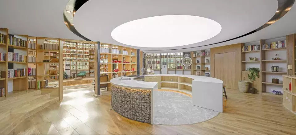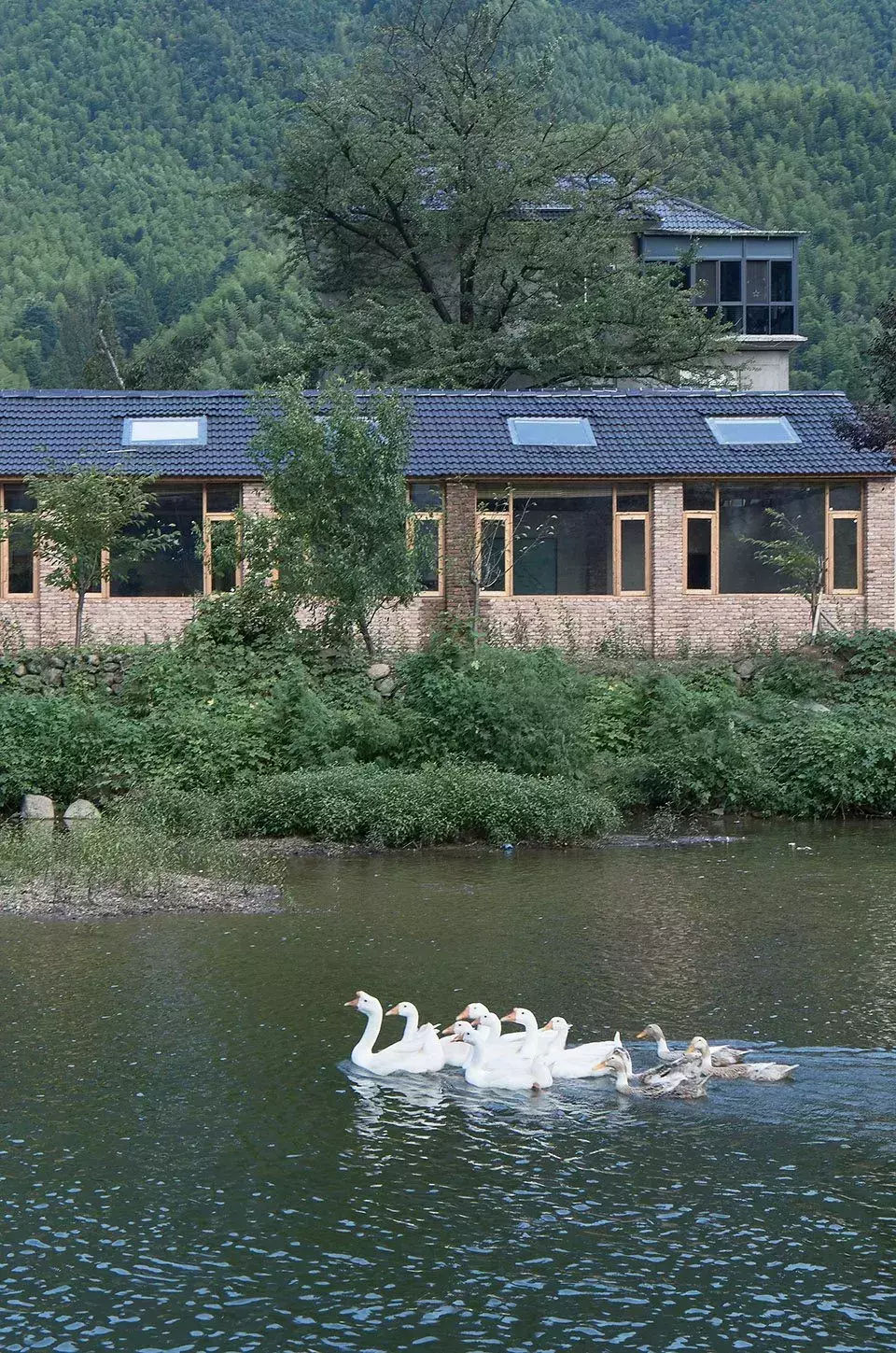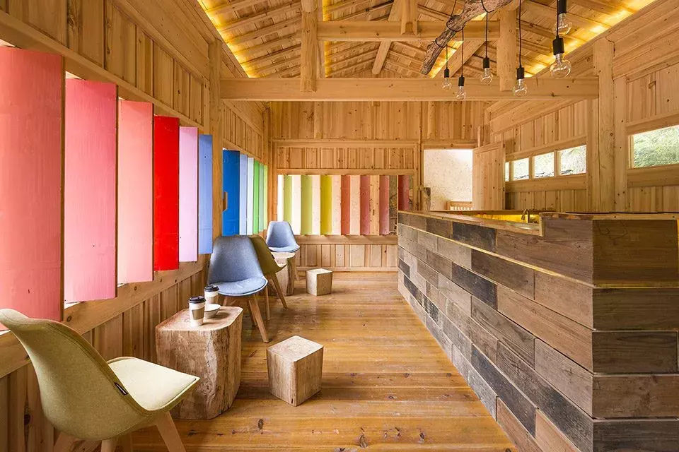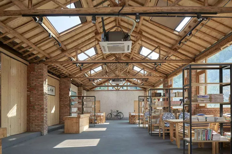 設(shè)計(jì)師在大空間中盡量多的設(shè)置天窗,使風(fēng)景最大化的映入室內(nèi),也盡可能減少對(duì)周邊民宅的干擾。施工中大量使用就地取材的鄉(xiāng)土材料,門窗由村里的老工匠制作。