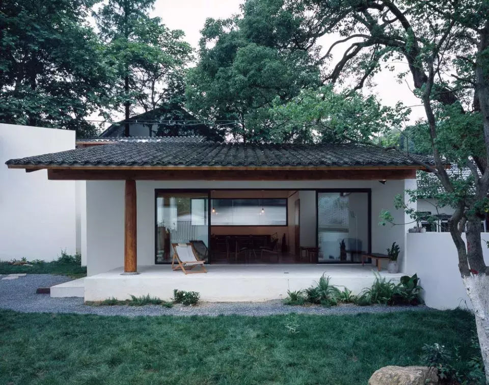 民宿位于浙江莫干山鎮(zhèn)庾村國(guó)營(yíng)時(shí)期蠶種廠的西側(cè),舊有的建筑散落在場(chǎng)地上,有些已破舊坍塌,樹木填充了村落肌理的剩余空間。