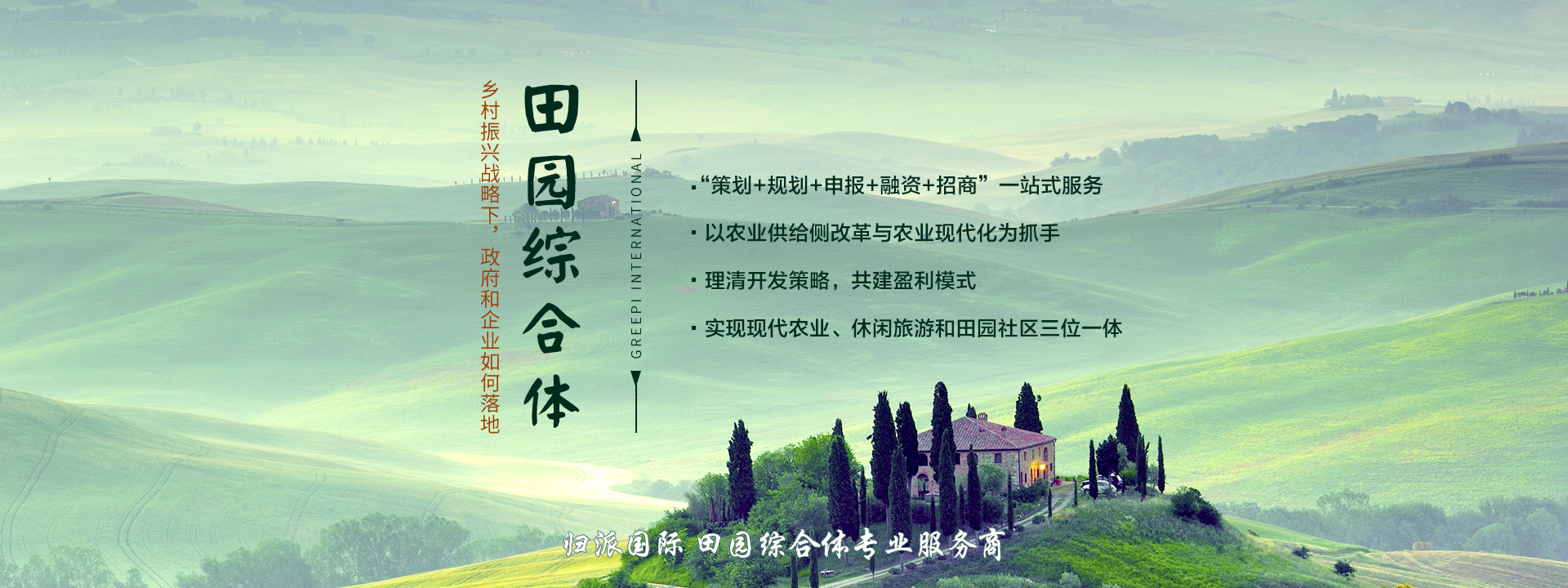 “策劃+規(guī)劃+申報(bào)+融資+招商”一站式服務(wù) 以農(nóng)業(yè)供給側(cè)改革與農(nóng)業(yè)現(xiàn)代化為抓手 理清開(kāi)發(fā)策略,構(gòu)建盈利模式 實(shí)現(xiàn)現(xiàn)代農(nóng)業(yè)、休閑旅游和田園社區(qū)三位一體