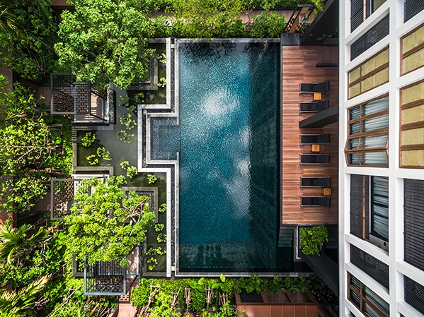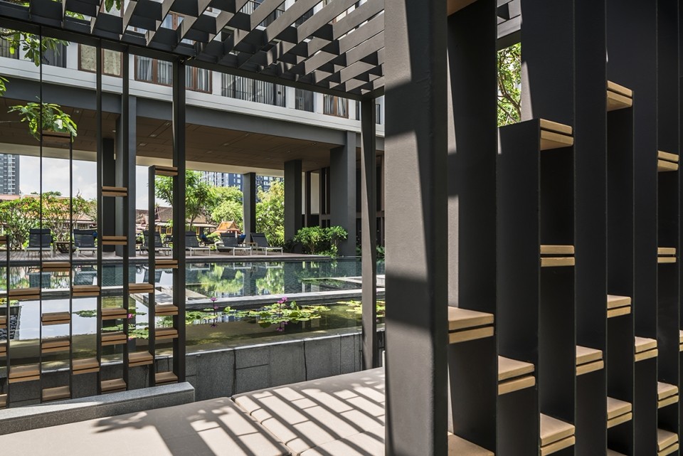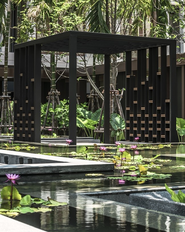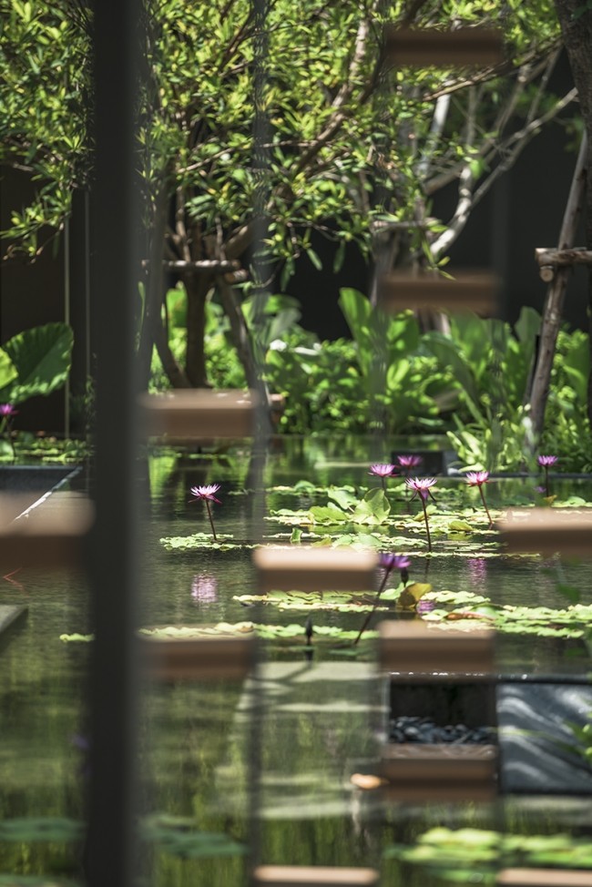 項(xiàng)目中的“睡蓮池”作為整個(gè)空間的核心區(qū)域,與周圍環(huán)境形成一種反射效果。水流從泳池邊緣溢出流到睡蓮池邊,這一設(shè)計(jì)營(yíng)造出了寧?kù)o的水聲效果。同時(shí)位于游泳池內(nèi)的2棵特色樹(印度橡樹)成為了整個(gè)空間的重要焦點(diǎn)。