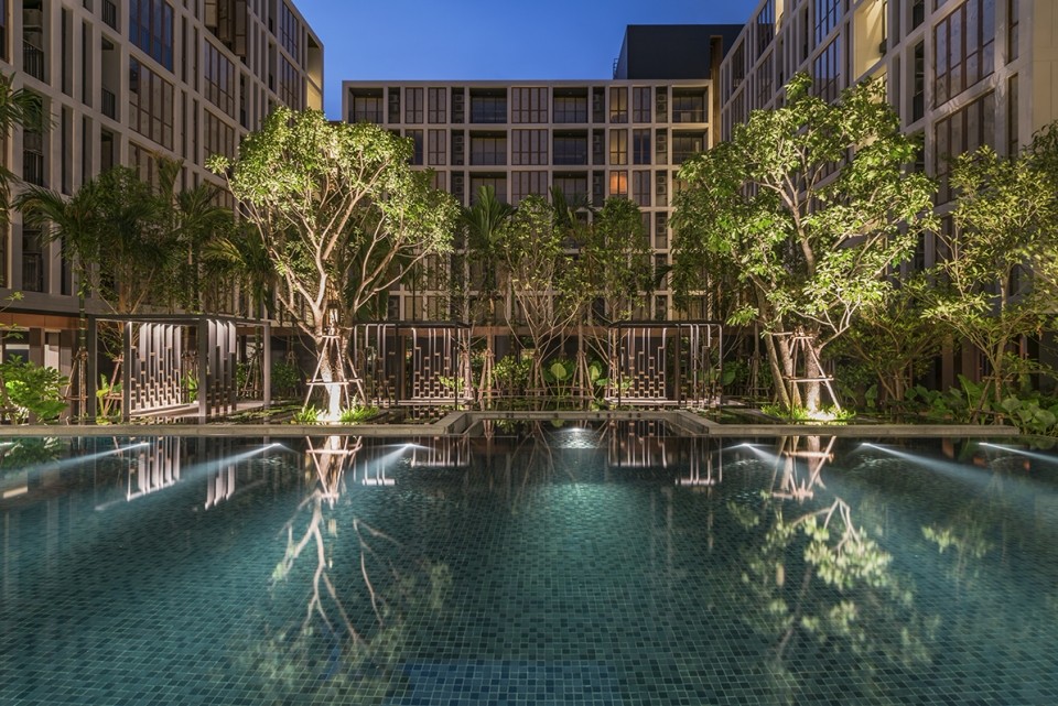 Hasu Haus is the condominium development situate amongst the tranquil neighborhood along Pra Kra Nong canal. As the surrounding environment context, the landscape feature of Hasu Haus project is designed to reflect the idea of “l(fā)iving with water” and “slow life”. The landscape concept is try to interpret the traditional Thai landscape space of “Baan Saun”( Home Garden) where composed of water lily pool which seamlessly connected with the swimming pool. The water court will be surrounded by rush tropical planting along with timber boardwalk. There are 3 floating pavilions interlocking with the “water lily pool”. The water court is also connected physically and visually to the outdoor terrace and function lawn next to the Pra Kra Nong canal. Some of the existing trees are kept to maintain the spirit of the place. New planting species/palate are well selected in order to blend in with the surrounding context of “???????” such as Rose Apple, Mango Tree, Jack Fruit, Areca palm along the site parameter while the planting palate inside the water court are Indian Oak, Areca palm, Tembusu ,etc.