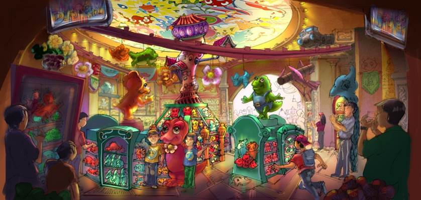 我們突破了一般主題公園大門的概念,創(chuàng)意性地采用恐龍花車與IP人物結(jié)合的方式,虛實(shí)結(jié)合,利用恐龍世界慶典的概念過渡樂園內(nèi)外空間,營造出強(qiáng)烈的空間氛圍。