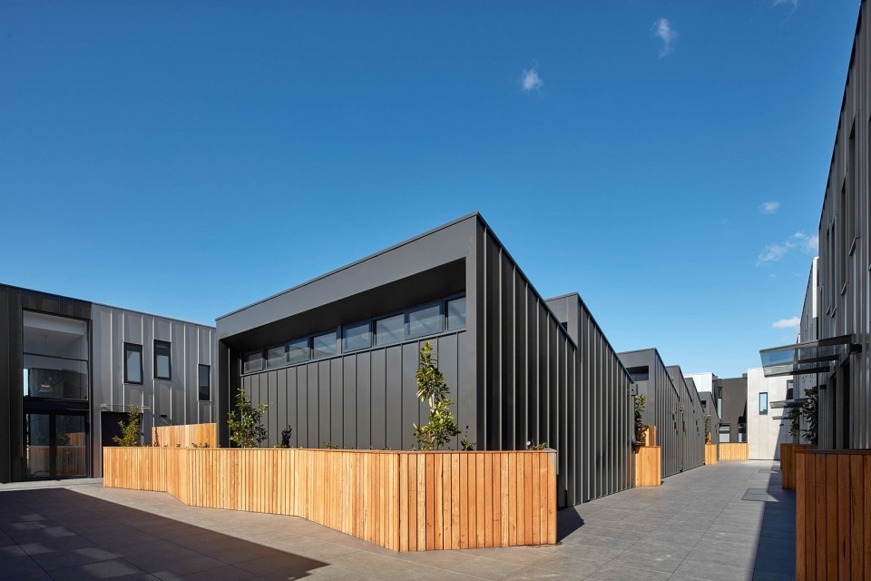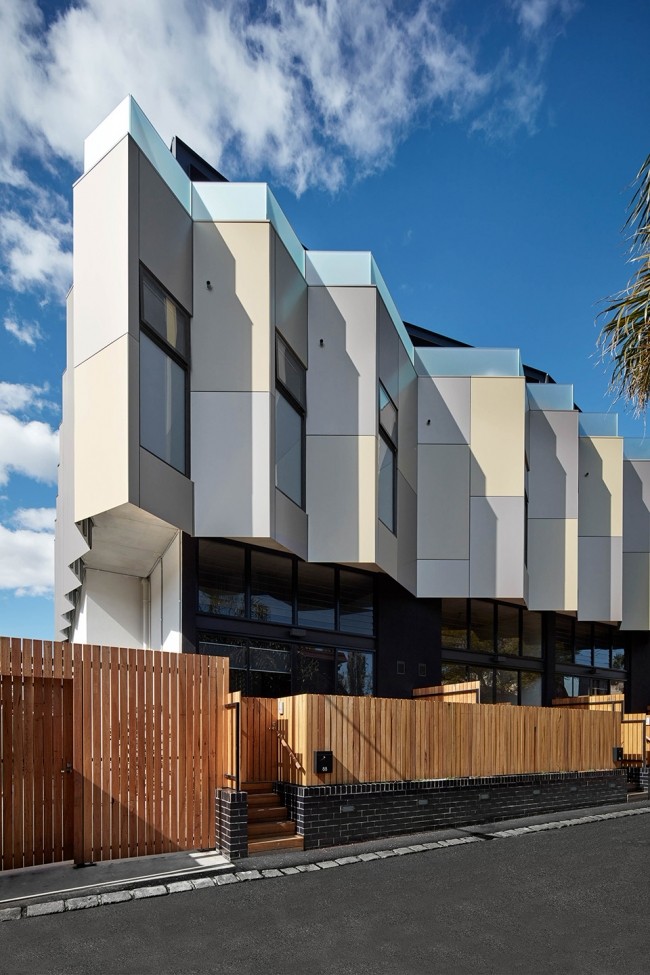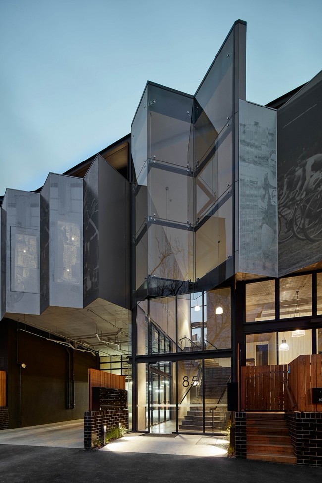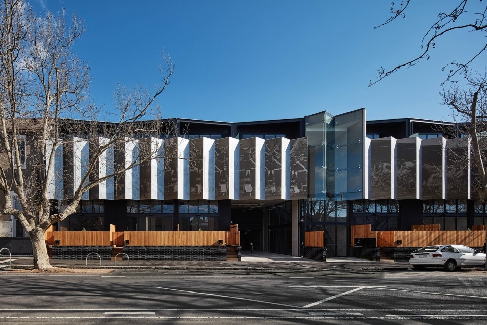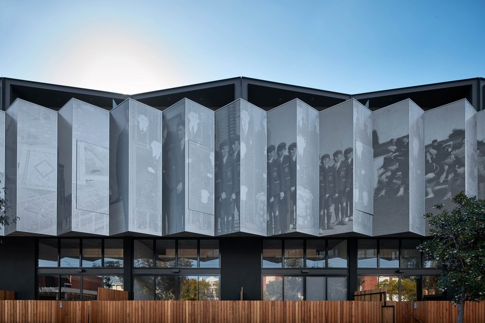 St. Joseph項(xiàng)目屬于一個(gè)高端住宅開(kāi)發(fā)項(xiàng)目,該項(xiàng)目坐落于維多利亞的Abbottsford。由于它的歷史意義,該場(chǎng)地已作為地區(qū)文化景觀的一部分。因此,這里的設(shè)計(jì)需要積極響應(yīng)和尊重這一歷史底蘊(yùn)。設(shè)計(jì)團(tuán)隊(duì)希望將學(xué)校文化和歷史的精華部分結(jié)合在一起,表達(dá)對(duì)過(guò)去和未來(lái)的頌揚(yáng)并達(dá)到一種平衡——為下一代創(chuàng)造“未來(lái)遺產(chǎn)”。設(shè)計(jì)團(tuán)隊(duì)通過(guò)詮釋和表現(xiàn)這個(gè)重要的“故事”,來(lái)展現(xiàn)圣約瑟夫技術(shù)學(xué)校所蘊(yùn)含的文化與歷史。其主要設(shè)計(jì)方法是在連續(xù)的屏風(fēng)上再現(xiàn)多幅同時(shí)代的歷史畫面,以此作為建筑的臨街立面。這些多面嵌板結(jié)構(gòu)創(chuàng)造出了一種光學(xué)現(xiàn)象“透鏡圖像”——單段的圖像會(huì)在特定的視點(diǎn)上匯聚,從而創(chuàng)造出完整的畫面效果。