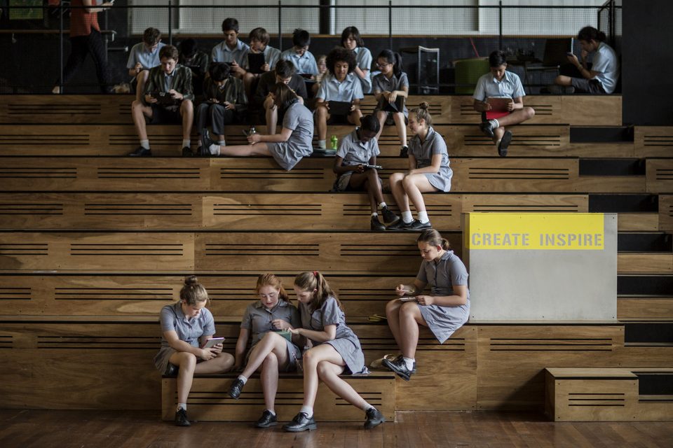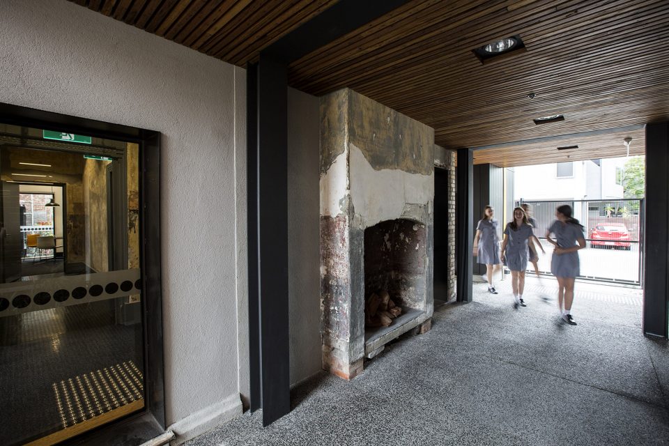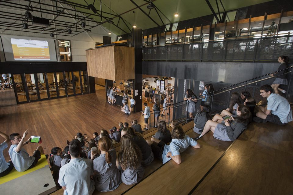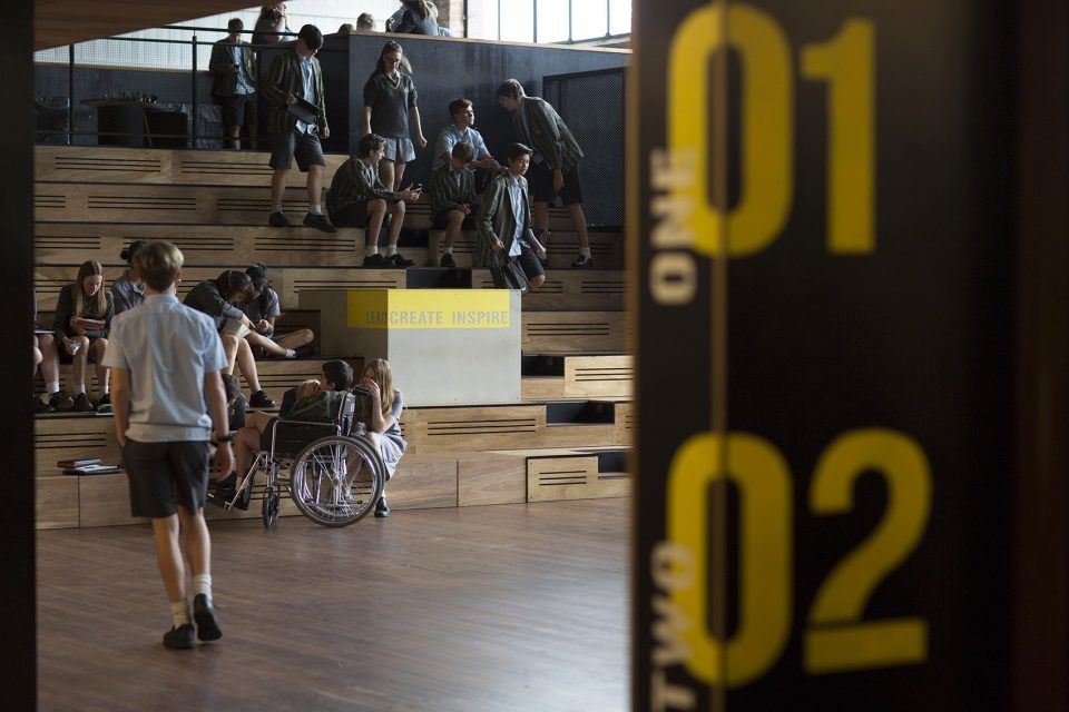 The design adapts the existing mezzanine and lower floors into large teaching and learning spaces and retains the Drilll Hall as a performance and teaching space. Connection of the two levels with a stepped timber seating area gives a unique appreciation of the building volume and increases the usefulness of the space for performance and large group activities.
