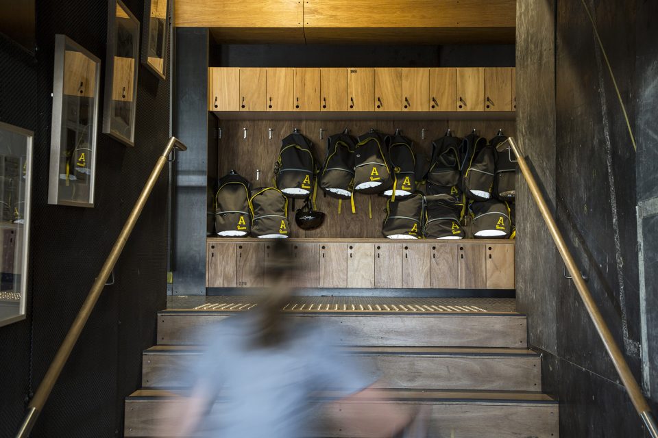設(shè)計(jì)將現(xiàn)有的夾層和底層空間改造為適應(yīng)大型活動(dòng)的學(xué)習(xí)性空間,并將 Drill 大廳保留為演藝和教學(xué)空間。兩層空間之間由一系列木制的看臺(tái)連接,既尊重了原有建筑空間的體量,由為大型團(tuán)體活動(dòng)提供了必要的觀賞設(shè)施。