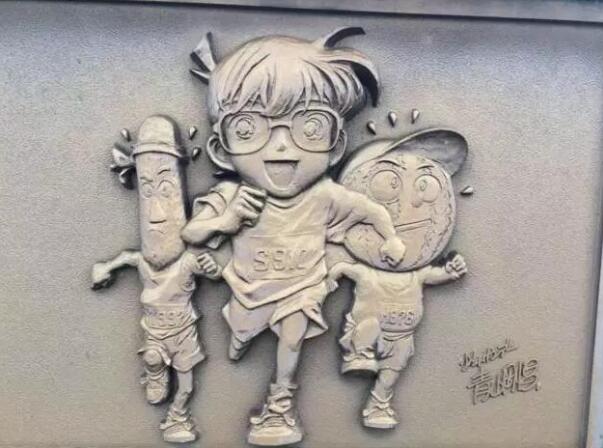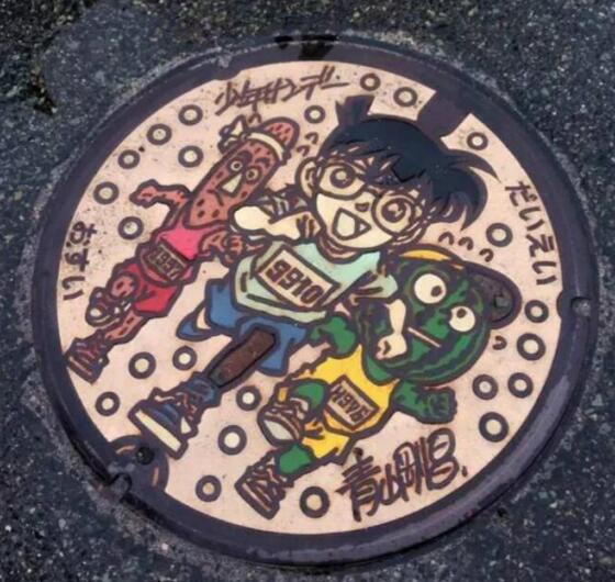 這個小鎮(zhèn)到處都遍布柯南的身影,柯南大橋、偵探所、博士的車、柯南列車、柯南文具、柯南食物、就連井蓋上都是柯南!