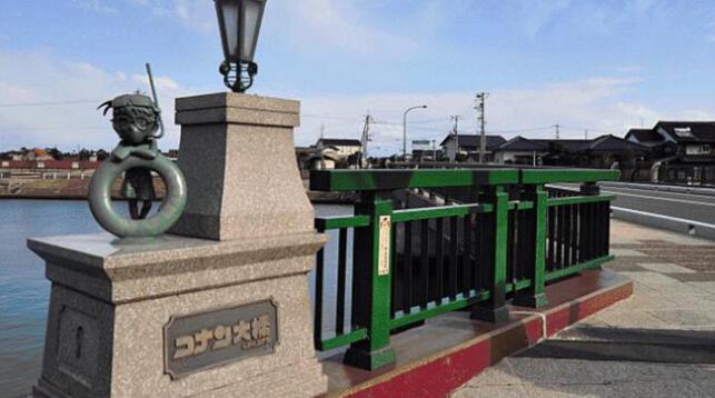 在柯南小鎮(zhèn)還有一個柯南大橋,在1999年的12月23日正式通行,全長約70公尺。橋的兩頭各有兩尊小柯南雕像,整座橋加上路燈共約有10個左右的柯南浮雕,據(jù)說不少皆為青山剛昌先生本人親自監(jiān)督完工。