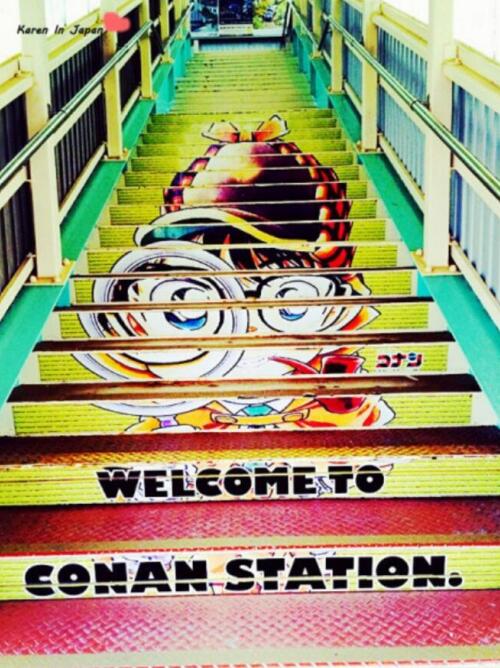 從大阪到柯南小鎮(zhèn),單程要三個小時以上,而最后半個小時的車程,有機會在倉吉轉(zhuǎn)車乘坐“柯南專線”列車來到小鎮(zhèn),車站的候車廳、指示牌全部是柯南的標(biāo)識,就連車站的樓梯上也寫著“歡迎來到柯南車站”。就連北榮町所在的鳥取縣的機場,也在2014年改名叫做“柯南機場”,沒想到這么早就開始搞事了!