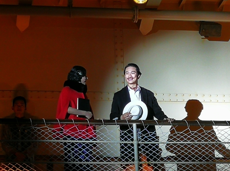 碼頭上,那艘以上世紀二三十年代,武漢民生公司“江華輪”1:1還原的蒸汽郵輪就是知音號了!碼頭上的黃包車、小轎車、貨箱,都在帶領(lǐng)游客經(jīng)歷這場穿越。此時,旁邊碼頭上響起了小提琴的樂曲,輪船上也躁動起來,年輕貌美的演員、與友人告別說著“古德拜”小哥、醉漢紛紛登場!碼頭、輪船;相遇、相知;揮手、告別;珍重、再見!……一個定格,告別的剎那變成了一幅凝固的畫面,大概就在那一刻仿佛觀眾們?nèi)霊蛄恕?/span>