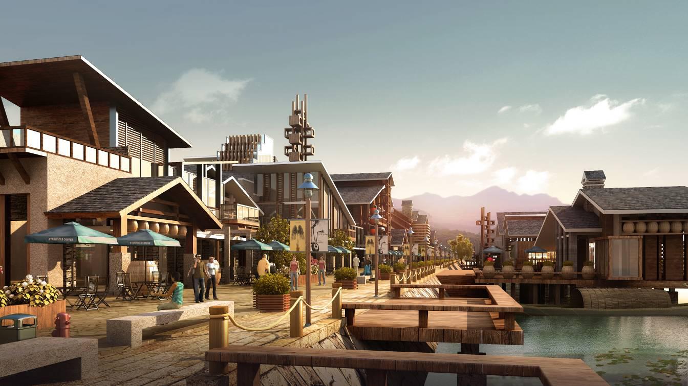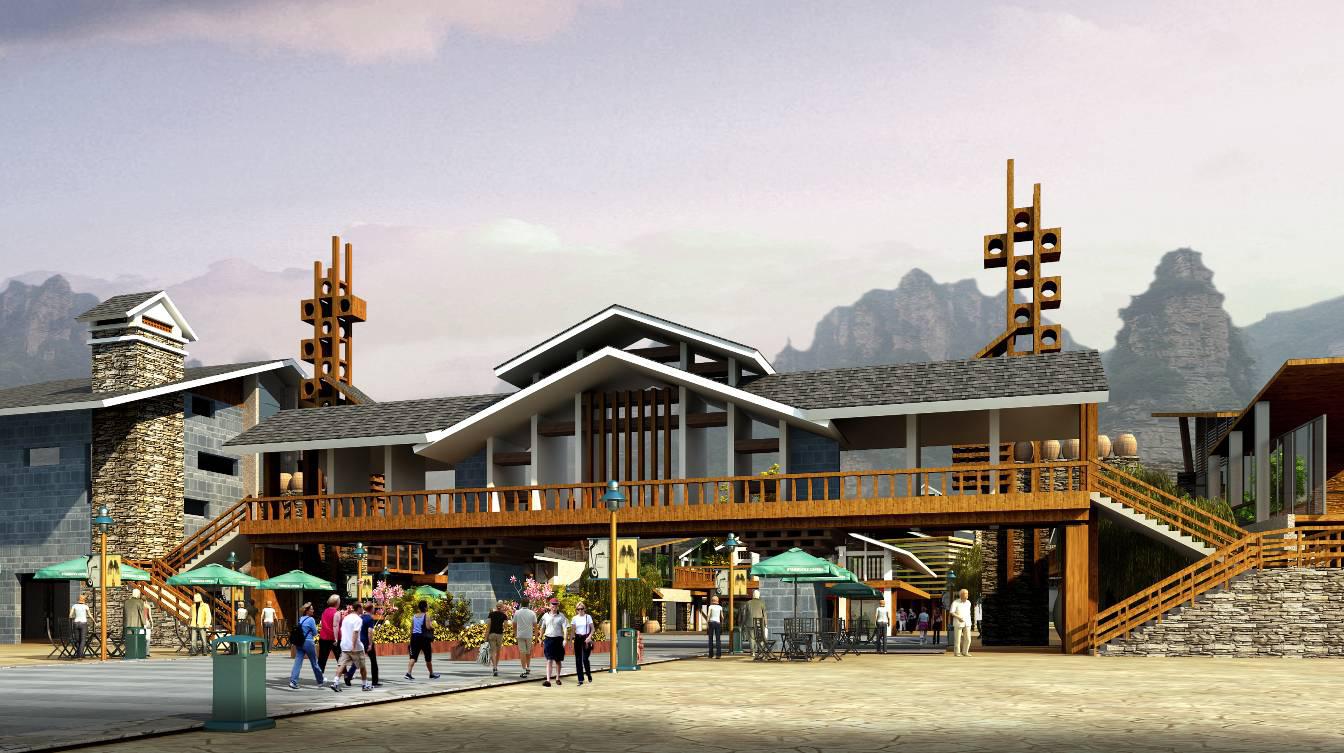 整體規(guī)劃院落圍合式布局,利用建筑形體和體量的組合,以線性飄積理論為原則,進行有機的布置;建筑力求浪漫、飄逸和通透,體現(xiàn)旅游特色商業(yè)街所應(yīng)具備的時尚和拙樸的氣質(zhì),同時滿足現(xiàn)代商業(yè)街區(qū)的功能和審美需求。