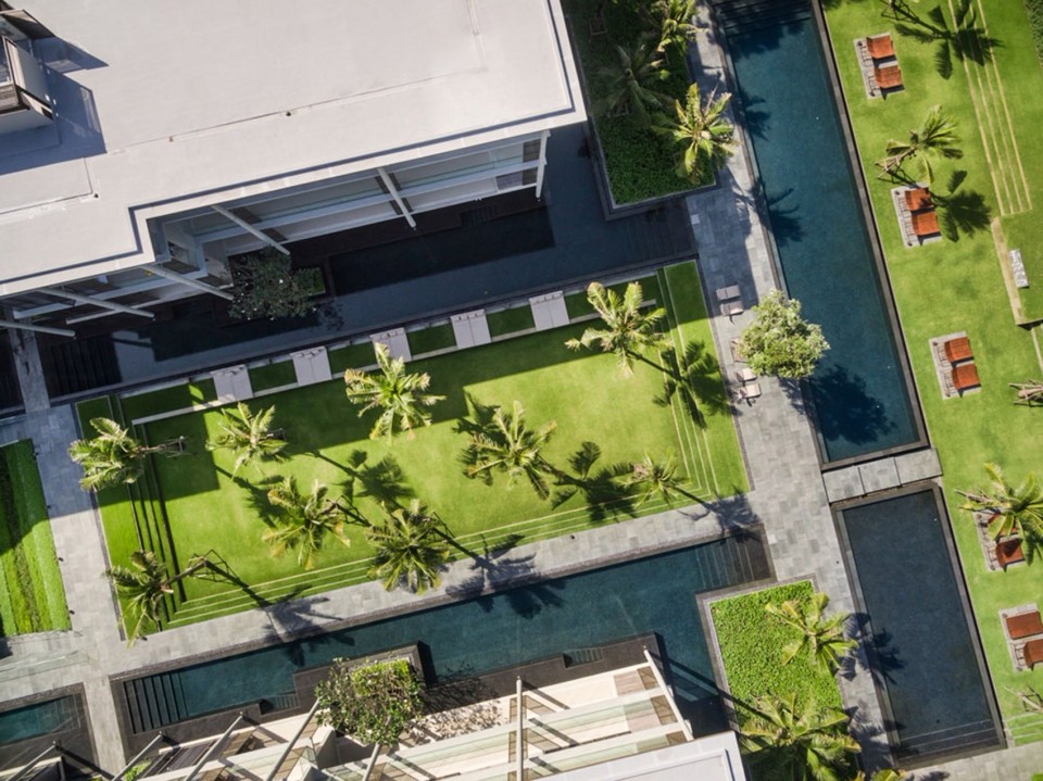 在設(shè)計中,建筑師引入了西方規(guī)則式庭院的元素,并將其與建筑內(nèi)使用的東方風(fēng)格的雷紋相結(jié)合。規(guī)則式庭院能夠容納各種功能空間,其概念由當(dāng)?shù)刂参飦韺?shí)現(xiàn),它們不僅提供了樹蔭空間,同時還非常適合泰國的當(dāng)?shù)貧夂?,更為重要的是,它們還體現(xiàn)了邁考海灘的特色。