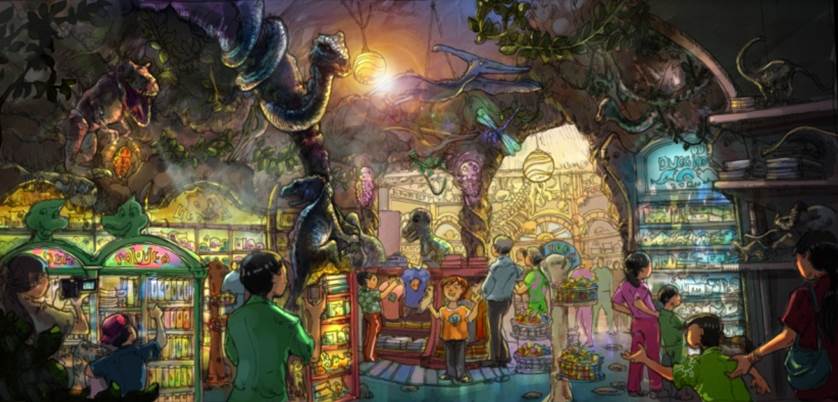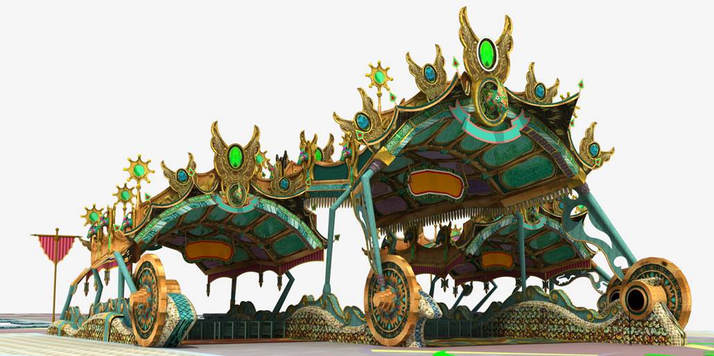 我們突破了一般主題公園大門的概念,創(chuàng)意性地采用恐龍花車與IP人物結(jié)合的方式,虛實(shí)結(jié)合,利用恐龍世界慶典的概念過渡樂園內(nèi)外空間,營造出強(qiáng)烈的空間氛圍。