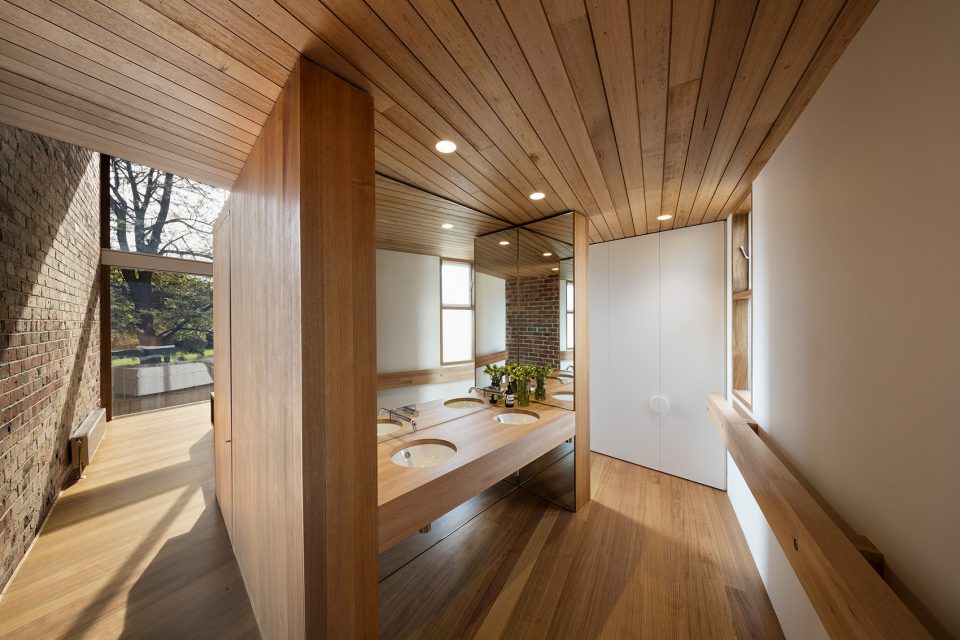 The feeling of being in the new space is of standing on-top the fence, in total connection with the park, with the split level allowing a lofty ceiling to accept the leafy aspect. The pavilion concept emerged organically from here. Timber posts form the boundaries of a “pavilion” and support a timber lined canopy overhead. The rhythm of these posts creates a tactility and depth to the edges of the space, modulating the hardness of the glass surface. The external clinker brick planes reappear to bookend the new interior, suggesting that the living areas are an external space.