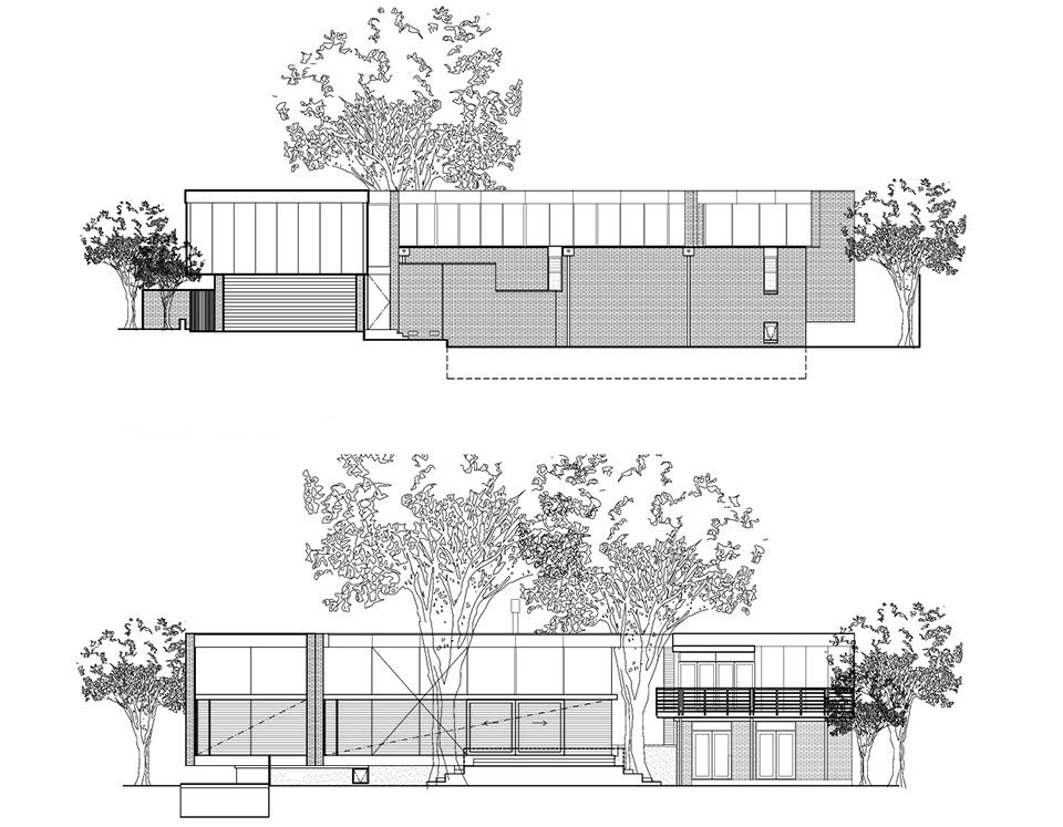 Simple ceramic pendant lights drape down at each post location and a dramatic fireplace reinforce the verticality of both the space and the neighbouring trees. The space defers to its mid-century roots in its horizontality, honesty in steel connections and braces, natural materials and joinery details. An external venetian blind enlarges the ubiquitous 50’s venetian, and the space is furnished with mid-century but forward looking furniture. The new living areas have been sited to face north east and north west. Large expanses of glass are utilized take in the natural beauty and allow winter sun to penetrate deep into the space. Sun penetration is regulated with northern eaves and an external venetian that spans the entire length of the main north eastern and north western fa?ades. All new spaces are naturally cross ventilated, and all natural timber Is native plantation oak.